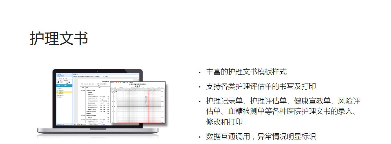 实现护理文书无纸化,与移动护理数据联动,操作简单,方便快捷。其中文书具体包括:体温单、入院评估单、护理记录单、长期医嘱单、临时医嘱单、血糖单、产科相关护理记录单、ICU相关护理记录单、疼痛单等多种特殊文书。解决了护理工作的压力,减少纸质文书的丢失与损坏,增加了护理实践,提高患者满意度,实现护理信息化的无纸化。
